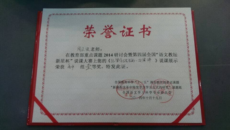 弘毅学堂高2015届理科语文周正波老师在第四届全国“教坛新星杯”说课中获一等奖第一名