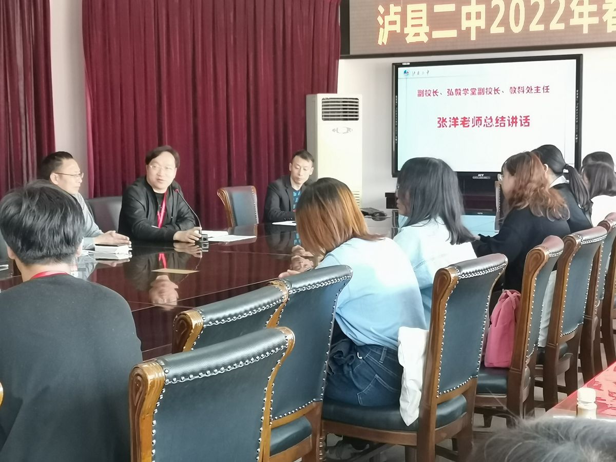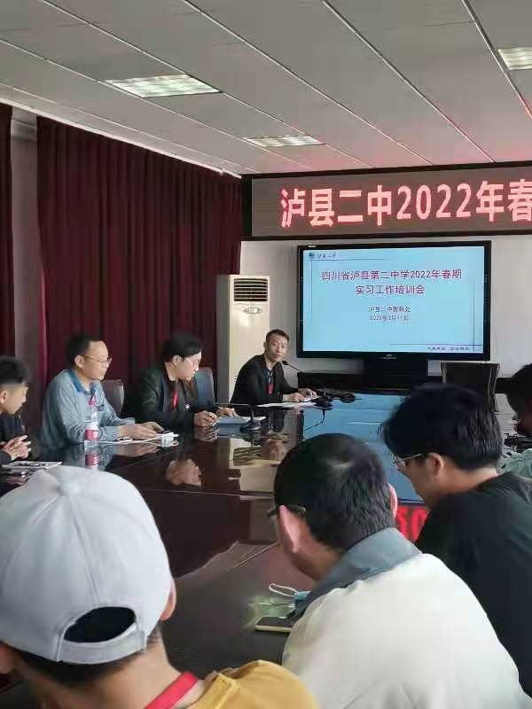 泸县二中2022年春期实习生培训会于2022年3月1日下午3点在博喻楼四楼会议室召开。本次会议由教科处副主任刘文祥老师主持,参与此次会议的人员有:泸县二中副校长、弘毅学堂副校长、教科处主任张洋老师,西华师范大学带队老师蒲老师及全体实习教师。