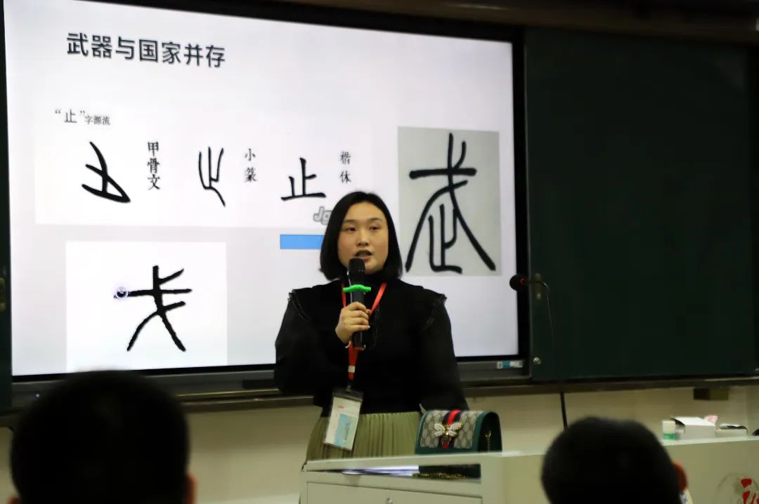接下来邓老师又从“樊”、“书”、“域”、“止”字出发,生动地给大家讲解了中国文化中的尚文精神和尚武精神,这些影响现在仍然留存在文字中,更留存在我们的生活中和精神中。