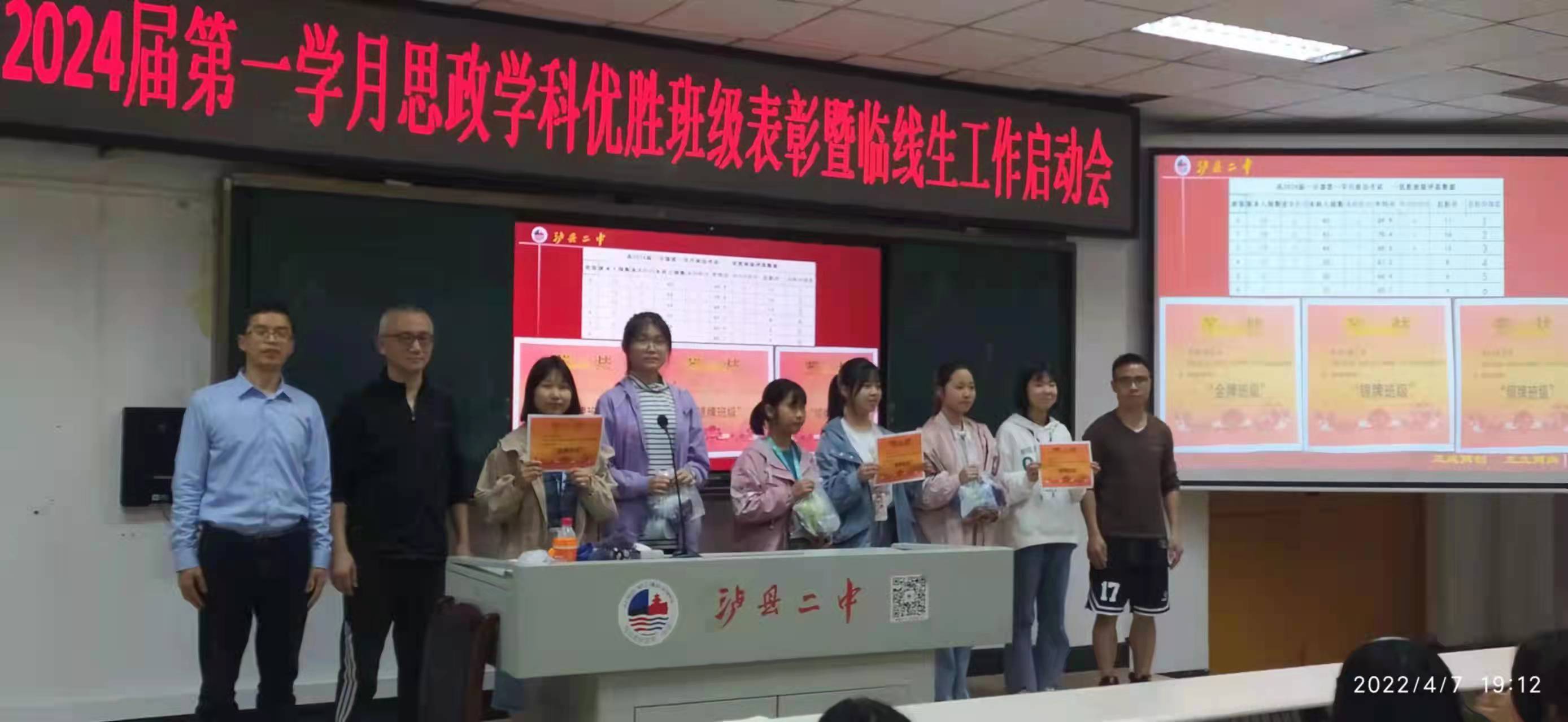 首先,张广老师向大家介绍了学科优胜班级评选方案,点评了各班的得与失,黄老师、何老师先后为2班、7班和5班颁奖并留影。
