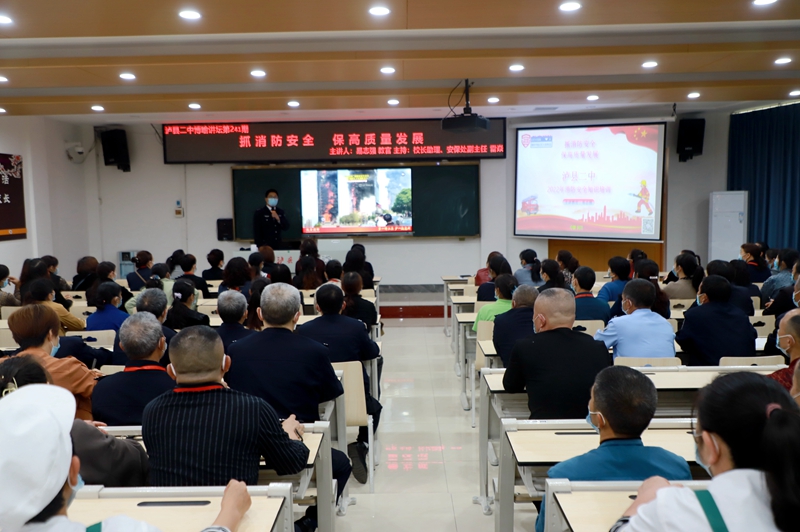 为提高师生员工对消防安全工作的认识,进一步掌握消防安全知识以及消防灭火器材的使用方法。11月3日下午,泸县二中“博喻讲坛”第114期在在兰蕙苑二楼阶梯教室如期举行,学校特别邀请了泸州政宣消防知识宣传中心易志强教官进行了以“抓消防安全、保高质量发展”为主题的消防知识专业培训。培训由校长助理、安保处副主任雷焱老师主持,理化生实验员、全体安保人员、全体生活指导教师、环卫物业管理人员、食堂员工等近200人参加。