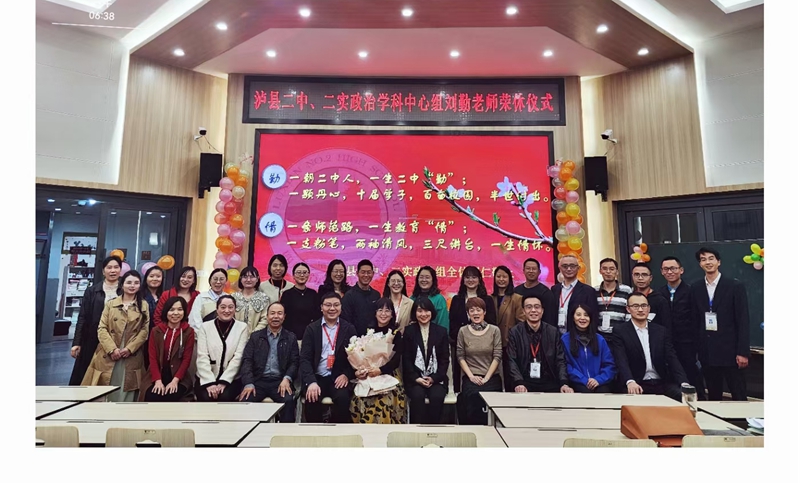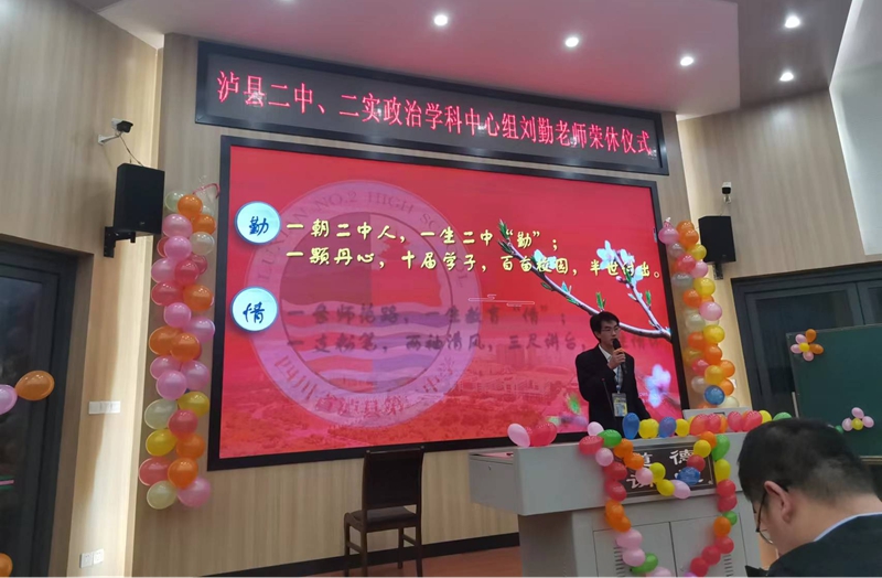 芳华育桃李,丹心写春秋。光荣退休是每位教师最激动、最幸福的一件事情。2022年10月25日下午,泸县二中六艺楼学术报告厅里洋溢着欢乐,涌动着温情,政治学科中心欢聚一堂,为刘勤老师举行隆重又温馨的荣幸休仪式。泸州市政治学科教研员肖玉芳老师、学校副校长陈明抢老师、学校校长助理黄治国老师,工会主席唐莉莉老师以及全体政治教师参加荣休典礼。