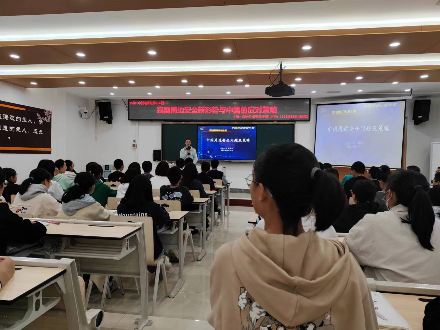 何老师通过国际热点和时事政治为大家讲述中国地理与政治条件,中国现今面临的安全威胁和应对国家安全的对策。心中有国,眼里有光,脚下才有力量。二中人更是中国人;二中魂更是民族魂,关注国家安全是我们必须的责任和义务,怀有一颗关心国家的心,成为一个建设国家的好青年。
