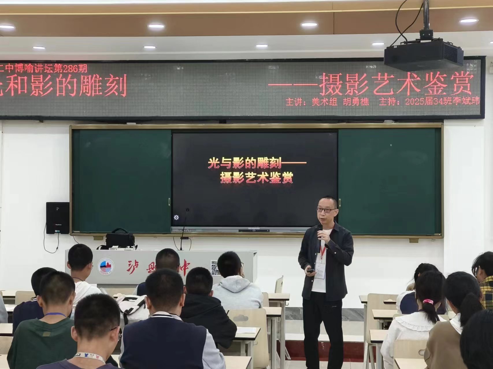 2024年5月12日下午,泸县第二中学第286期博喻讲坛于兰蕙苑二楼阶梯教室进行。此次讲座的主题是“光与影的雕刻--摄影艺术鉴赏”,由胡勇樵老师主讲,高2025届34班李斌玮同学主持。