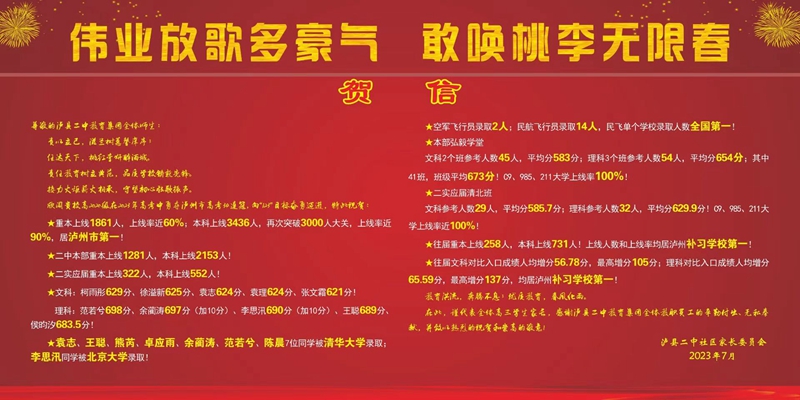 祝贺高2023届学生在2023年高考中再创佳绩,勇夺泸州市高考34连冠!