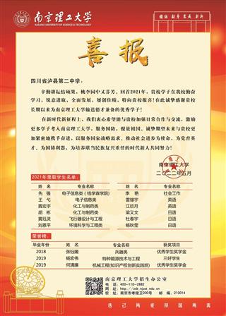 2022-05-11南京理工大学致泸县二中喜报近日,南京理工大学向我校发来喜报,祝贺我校2021届先强等12名同学考取该校。同时,祝贺我校校友在南京理工大学勤奋学习,锐意进取,全面发展,屡创佳绩。其中,杨宏伟获得“三好学生”称号,张钰媛、何清廉获得优秀学生奖学金。这是全国一流高校对泸县二中优秀学子的肯定,也是对泸县二中办...阅读 - 31 2022.03