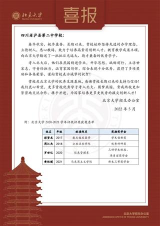 2022-05-31北京大学致泸县二中喜报春华秋实,桃李盈香。近日,北京大学向我校发来喜报,祝贺我校学生在北京大学锐意进取,勤奋钻研,取得佳绩。其中,彭贤龙获得“学术创新奖”;周江杰获得“优秀科研奖”;罗世亿获得“三好生标兵”“李彦宏奖学金”;黄林媛获得“新生三等奖学金”。并致谢泸县二中长期坚持先进的办学理念,立德...阅读 - 29 2022.05